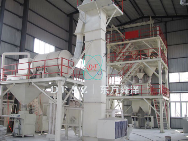斗式提升機進料斗加大(能容納1批次攪拌所需玻化微珠容量),膠粉料計量秤安裝在加料斗上方,短時間內由大型垂直提升機將所有原料提至滾筒混合機進行離心式無破碎混合。